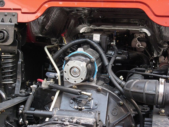 可以得到發(fā)動(dòng)機(jī)最大扭矩的取力器,一般在離合器和變速箱之間的變速箱一軸上取力。主要用于水泥泵車、高空消防車等需要大功率的專用車上