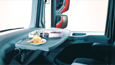 折疊桌(選裝配備)易于展開和折疊,讓你能夠在副駕駛員一側的放松環(huán)境中進餐和工作。折疊桌面非常耐磨.在天龍系列駕駛室副座前方能夠收納于后部儲物箱或前窗玻璃上方的中間儲物箱之中。折疊桌也作為天龍駕駛室的選裝配備。